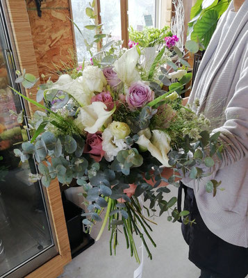 生花ブライダルブーケは、ドレスの色やデザインや、お客様のお好みに合わせて、お作り致します。季節により、入荷が困難なお花もございますので、